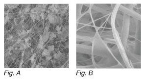 Fotografías tomadas a 10,000x, estás imágenes ilustran el diámetro de la fibra más fina y una mayor consistencia del medio fíltrate Helior™ (figura A), cuando es comparado con el medio filtrante de micro-fibra de vidrio ULPA (figura B).